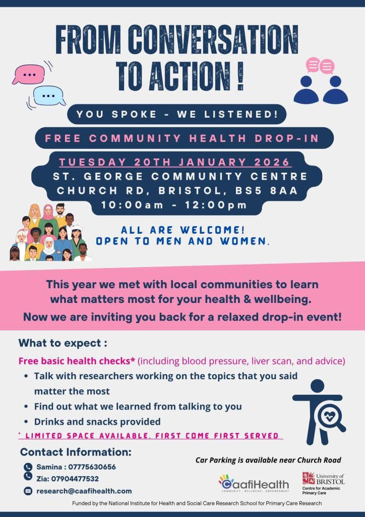 As many of the priorities identified revolve around primary care / GP services, in partnership with the Centre for Academic Care (CAPC) at the University of Bristol, the Health Ambassadors will be hosting three community health events – one each in South Gloucestershire, Bristol, and North Somerset.