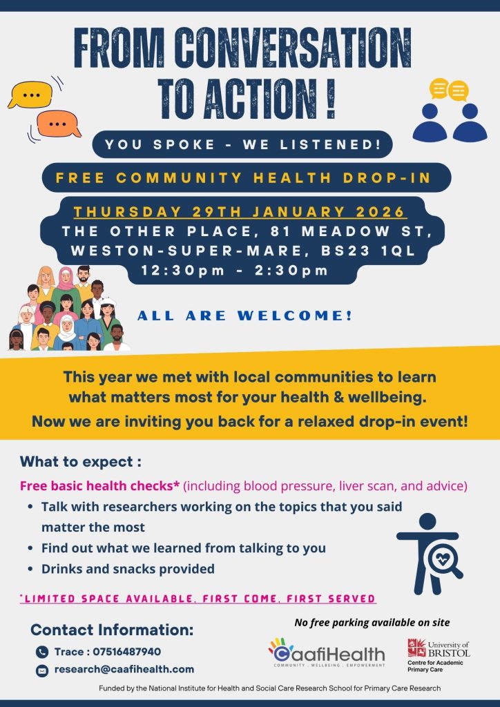 As many of the priorities identified revolve around primary care / GP services, in partnership with the Centre for Academic Care (CAPC) at the University of Bristol, the Health Ambassadors will be hosting three community health events – one each in South Gloucestershire, Bristol, and North Somerset.